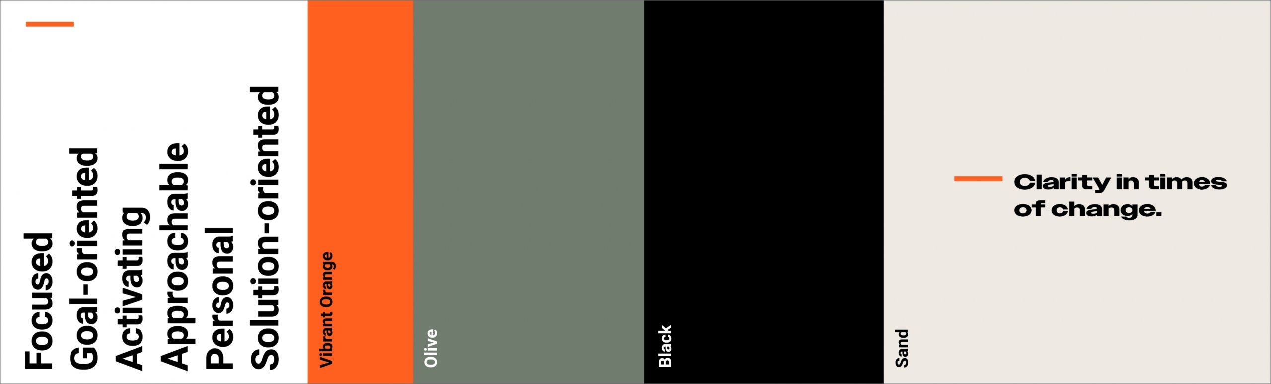 Die reduzierte Farbwelt schafft eine klare Struktur und unterstreicht den strategischen Anspruch der Marke. Das Orange fungiert, reduziert eingesetzt, als gezielter Akzent und steht für den Dialog auf Augenhöhe und Persönlichkeit. Man verbindet mit der Farbe Orange Aktivität, Kreativität und Dynamik – Werte, die den Beratungsansatz prägen, ohne visuell dominant zu wirken.